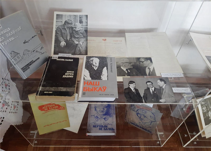 У экспазіцыі музея знаходзяцца дакументы, фотаздымкі, творы Васіля Быкава, копіі малюнкаў і асабістыя рэчы народнага пісьменніка.