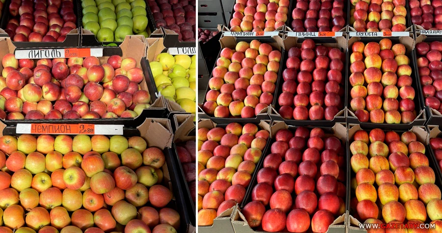 На «Новом Лебяжьем» есть польские (!) яблоки разных сортов. Их не было зимой в Беларуси ни в магазинах, ни на рынках из-за действующего в стране эмбарго на импорт продовольственных и сельскохозтоваров из так называемых недружественных стран.