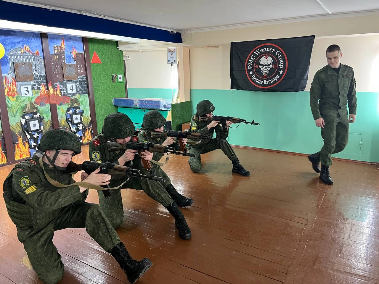 При этом на четырех фотографиях видно, что на стене помещения, которое, судя по всему, является факультетским тиром, висит флаг ЧВК Вагнера — черное полотно с круглой эмблемой группировки с черепом в центре.
