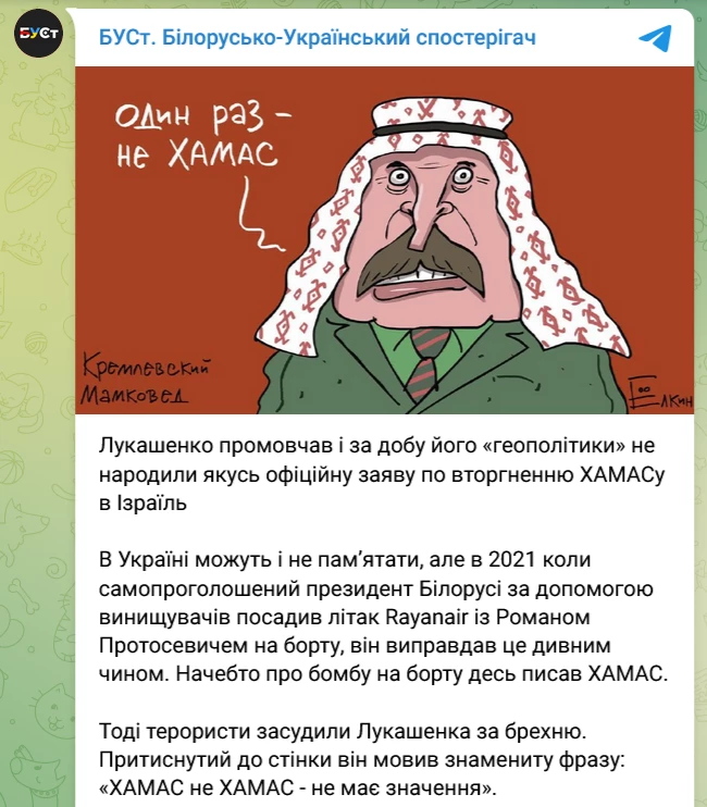 В Украине могут и не помнить, но в 2021 году, когда самопровозглашенный президент Беларуси с помощью истребителей посадил самолет Ryanair с Романом Протосевичем на борту, он оправдал это странным образом. Вроде бы о бомбе на борту где-то писал ХАМАС.