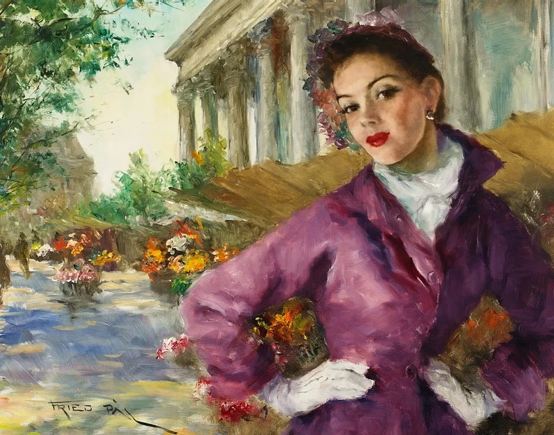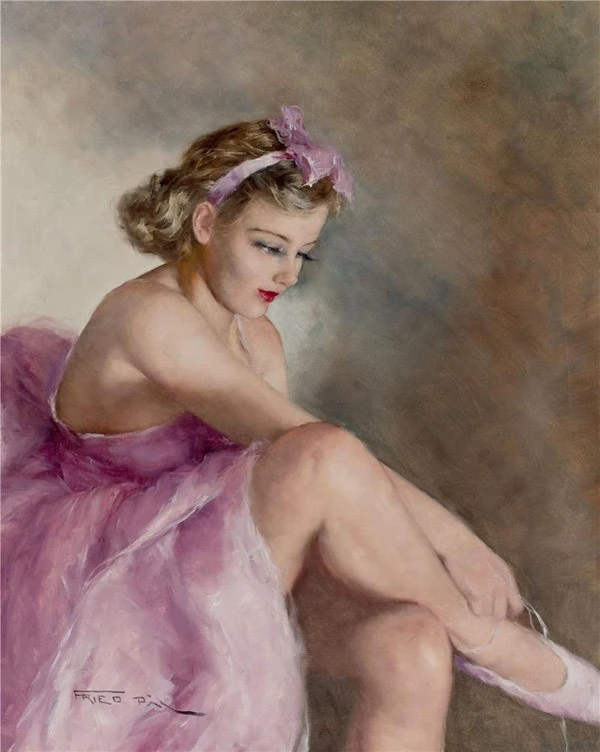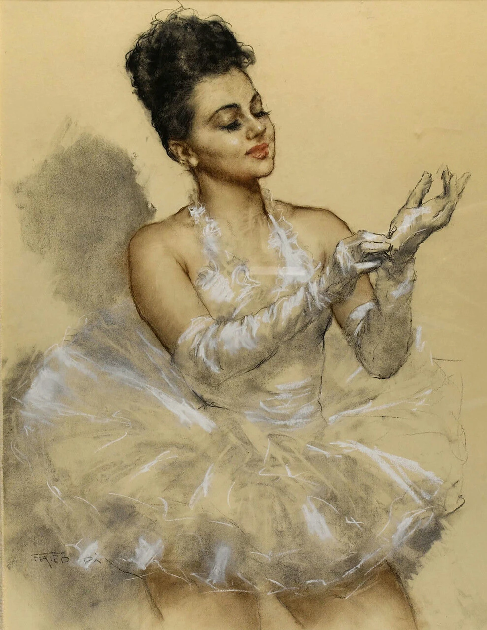 Разработав свой уникальный стиль, Фрид предпочитал рисовать дам из высшего общества, выбрав пастель и масло.