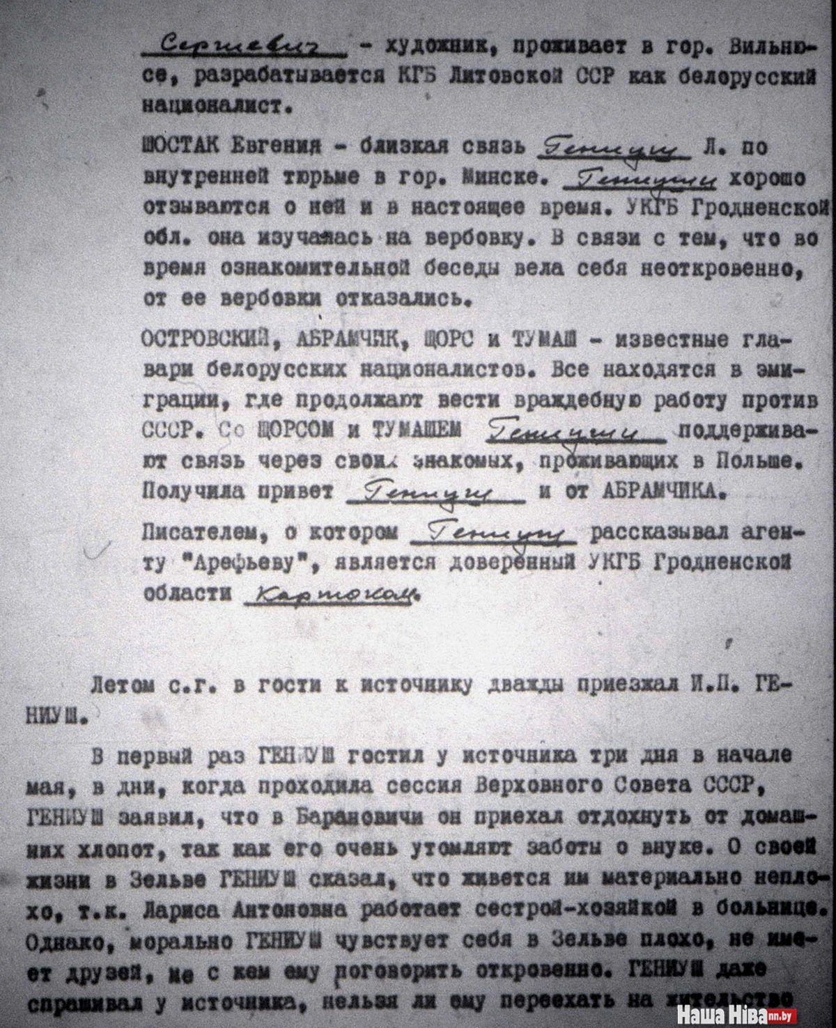 «КГБ пры СМ Беларускай ССР распрацоўваецца беларускі нацыяналіст Геніюш Іван, які вярнуўся са зняволення, працуе ў адной з бальніц гор. Слоніма, Гродзенскай вобласці. Яго жонка Геніюш Ларыса, у мінулым вядомая беларуская паэтка, таксама адбывала пакаранне за нацыяналістычную дзейнасць.