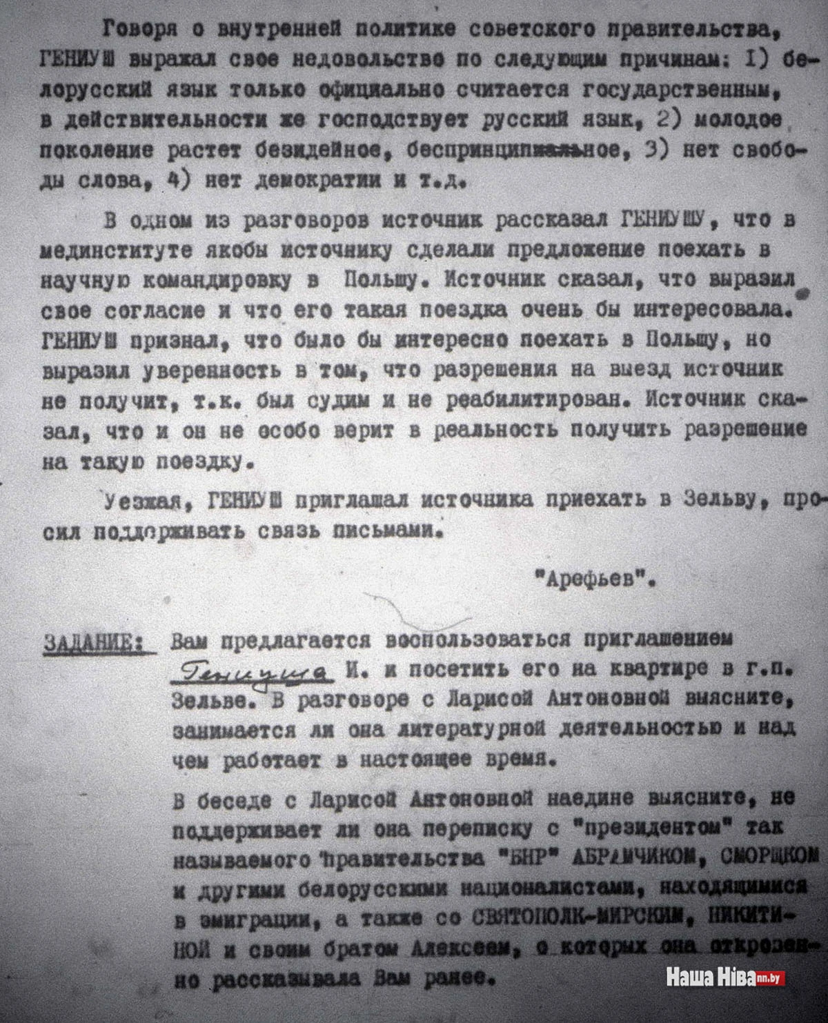 Распрацоўку Геніюш І. і Геніюш Л. вядзе правераны агент КГБ пры СМ БССР «Арэф’еў», які карыстаецца ў іх даверам.