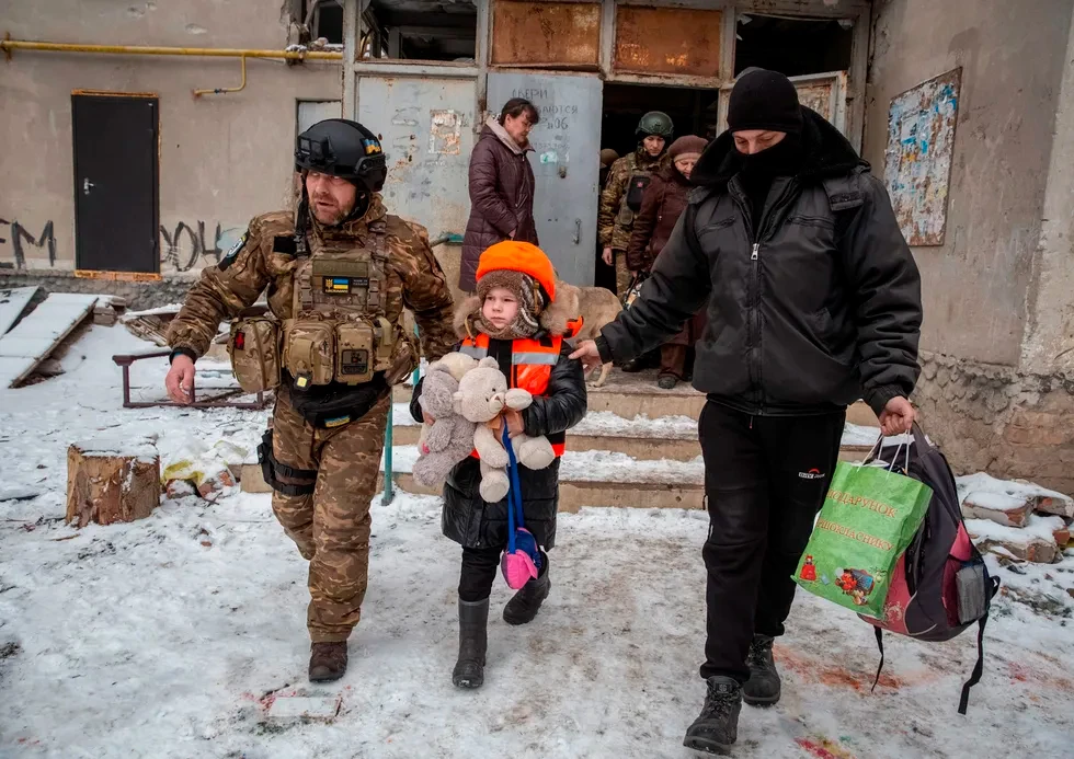 Фотофакт: украинские полицейские готовят Арину, одетую в детский бронежилет, к эвакуации из Бахмута.