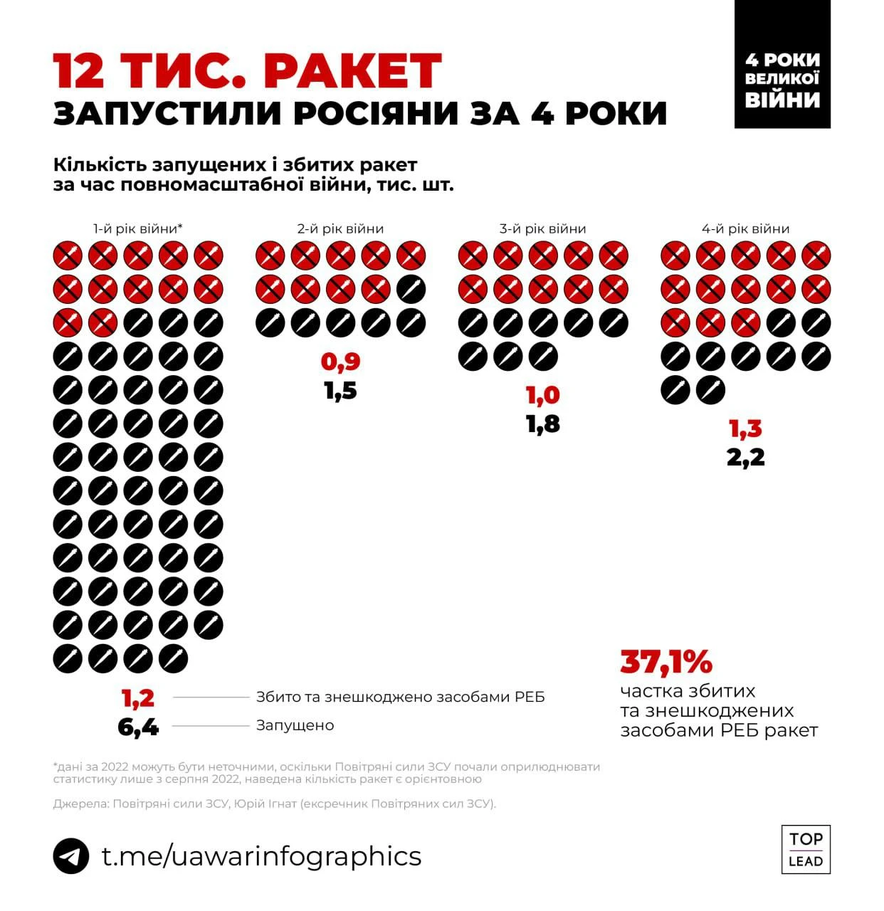 12 тысяч ракет и 78,4 тысячи дронов выпустила Россия за 4 года полномасштабной войны, — UA War Infographics.