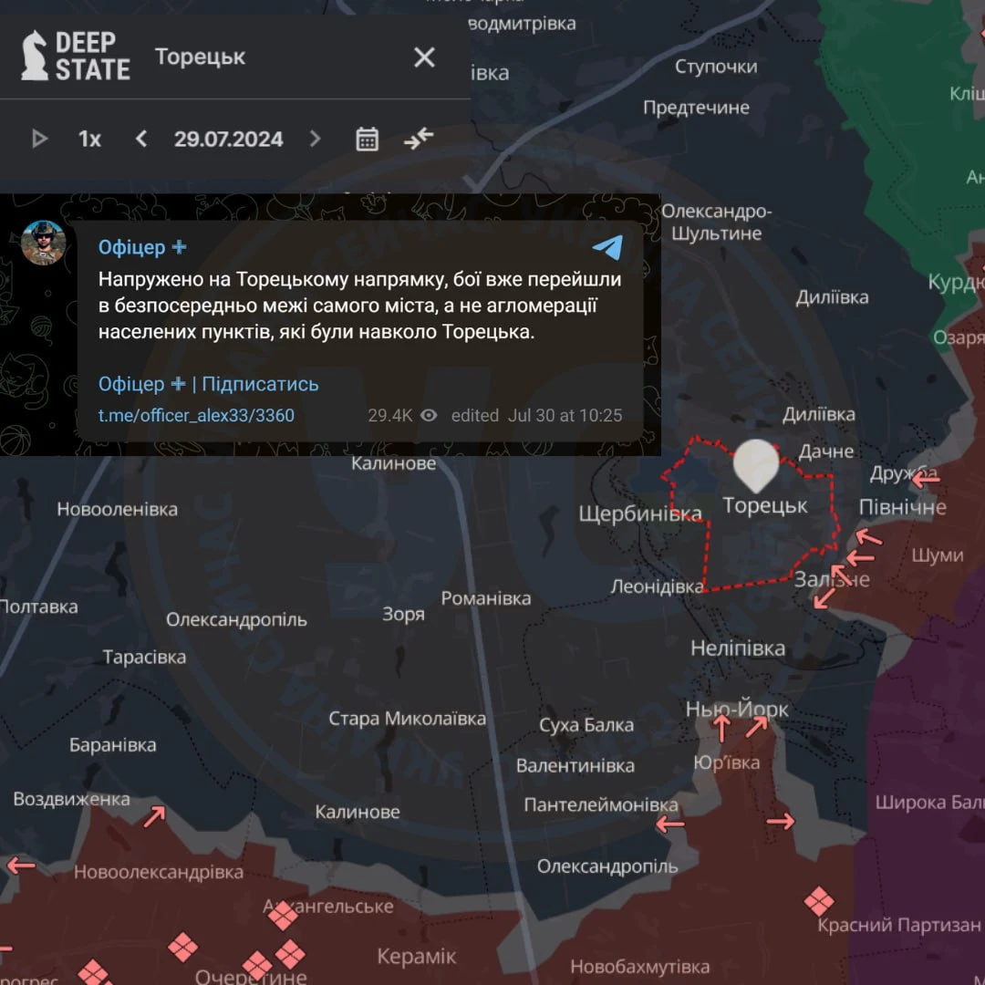 Сообщается, что россияне вошли в Торецк, бои перешли уже на самые пределы самого города. ВСУ официально информацию пока не подтвердили.